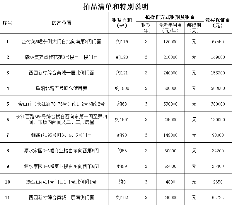 一、拍賣(mài)標(biāo)的:位于合肥市金荷苑6幢東側(cè)大門(mén)自北向南第8間門(mén)面等11間房產(chǎn)租賃權(quán)(房產(chǎn)面積、年租金參考價(jià)、競(jìng)買(mǎi)保證金等信息詳見(jiàn)拍品清單和特別說(shuō)明)。