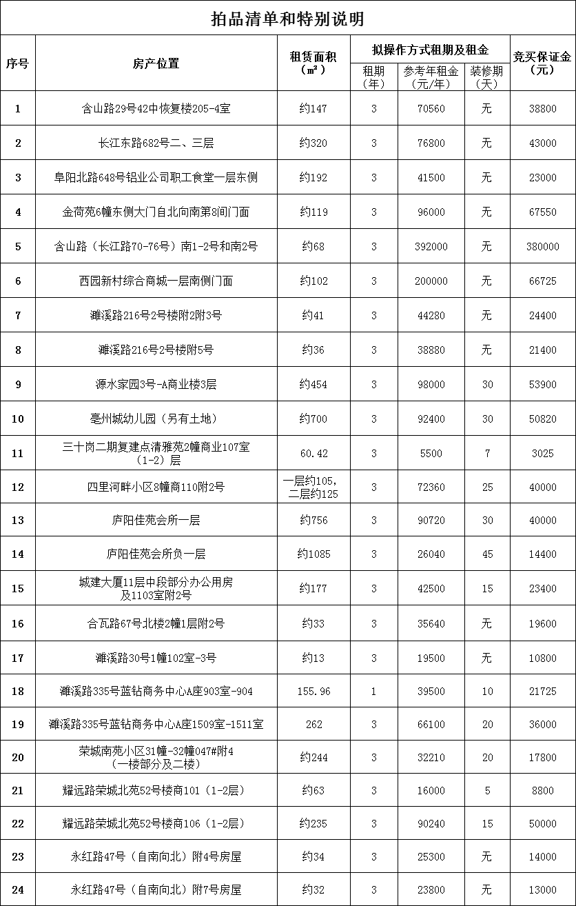 一、拍賣標(biāo)的:位于合肥市濉溪路216號(hào)2號(hào)樓附2附3號(hào)等24間門(mén)面租賃權(quán)(房產(chǎn)面積、年租金參考價(jià)、競(jìng)買(mǎi)保證金等信息詳見(jiàn)拍品清單和特別說(shuō)明)。