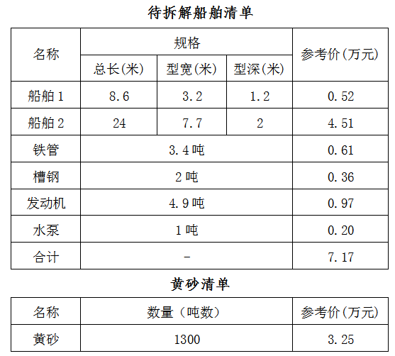 采砂船2條及采砂機具待拆解處置殘值、黃砂整體拍賣,參考價104200元。