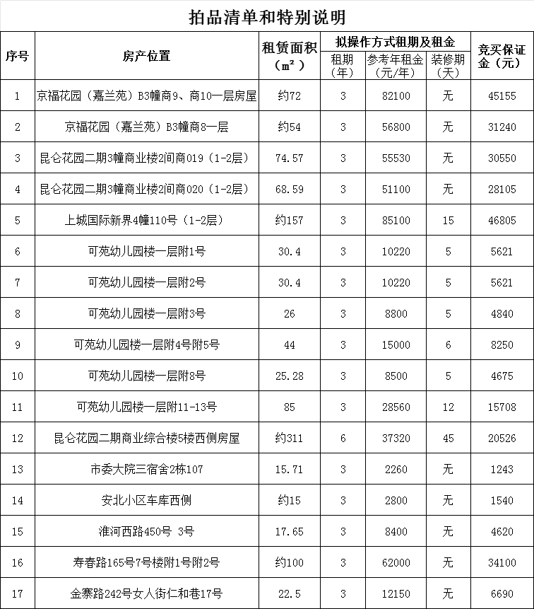 一、拍賣標(biāo)的:位于合肥市京?;▓@(嘉蘭苑)B3幢商9、商10一層房屋等17間門面租賃權(quán)(房產(chǎn)面積、年租金參考價(jià)、競(jìng)買保證金等信息詳見拍品清單和特別說明)。